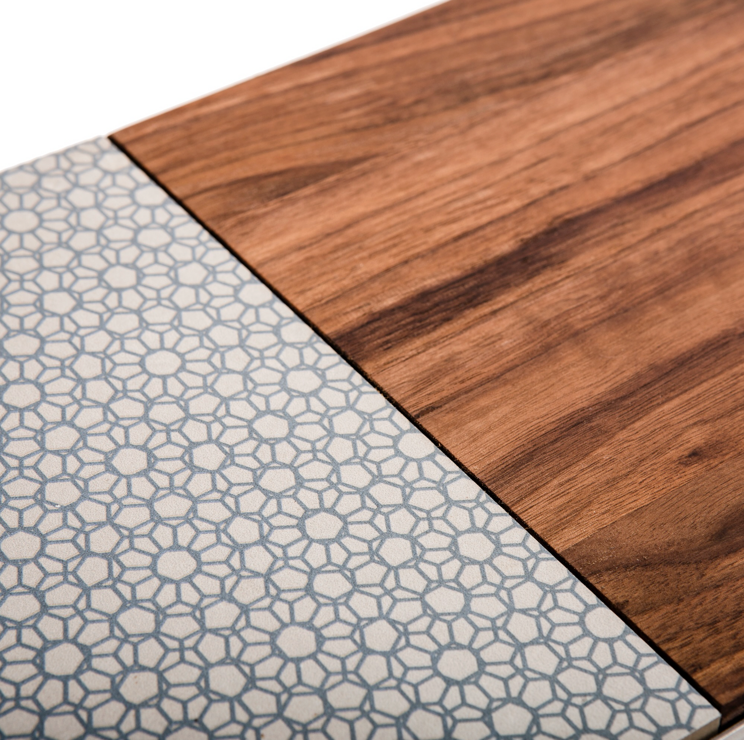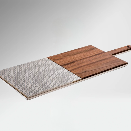 De In-Taglio serveerplank van Patricia Urquiola voor Mutina combineert massief notenhout met porseleinen details in een verfijnd stalen frame. Met zijn formaat van 52×20 cm is hij ideaal om gerechten elegant te serveren en voegt hij een vleugje design toe aan elke tafel. Verkrijgbaar in Azzurro en Marrone – waar warme en moderne materialen samenkomen in perfecte harmonie.
